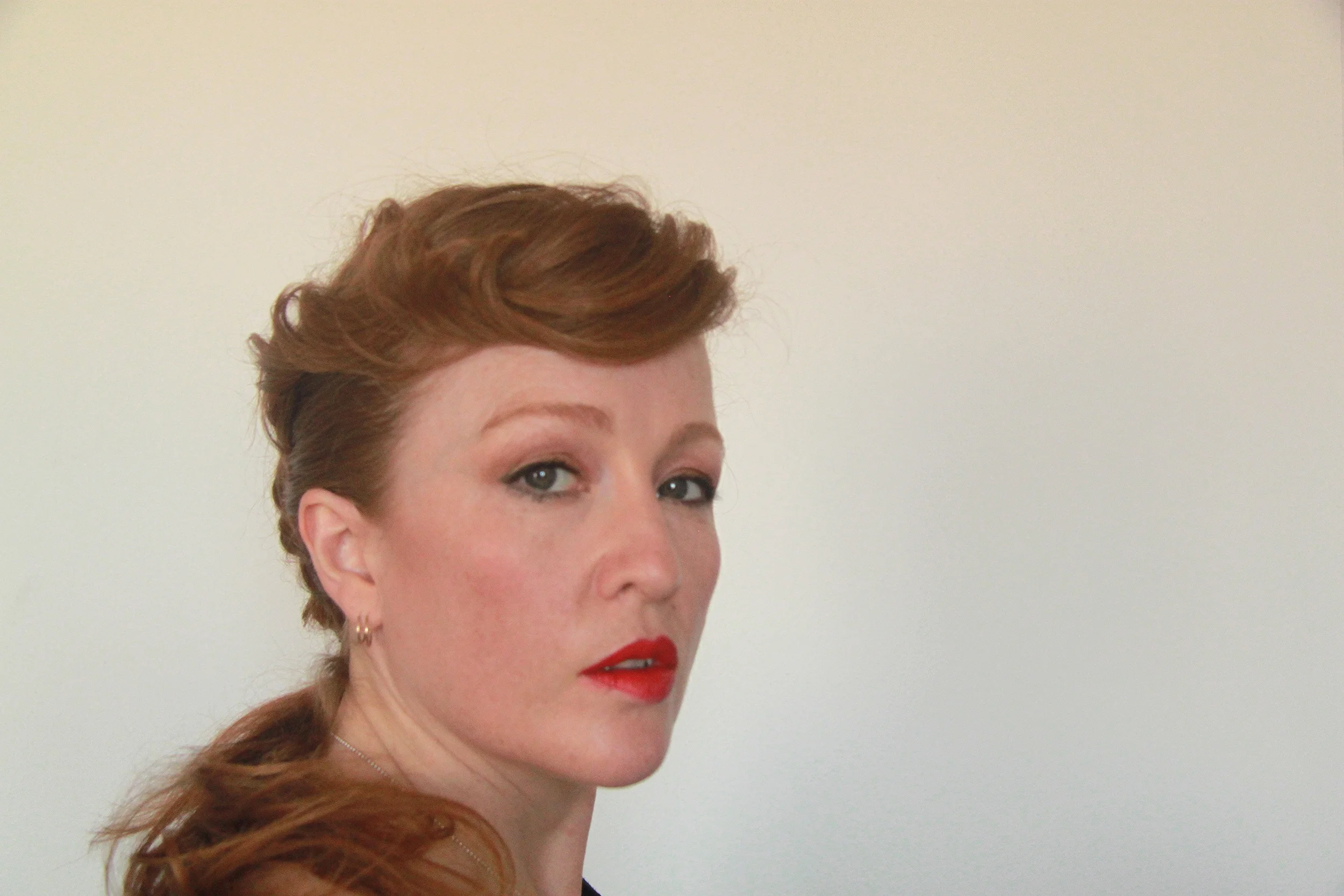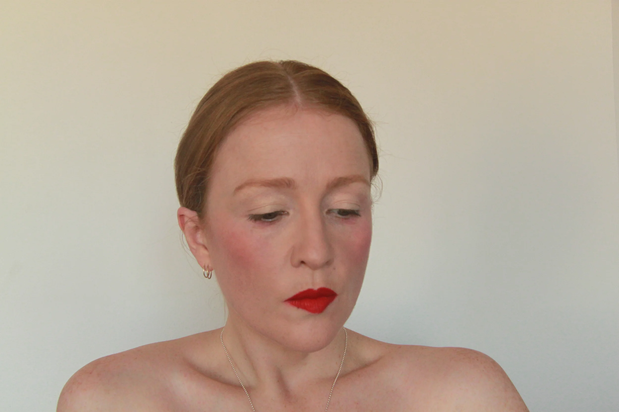 Pearl shimmer eye, high pink cheekbone with matte red lip.