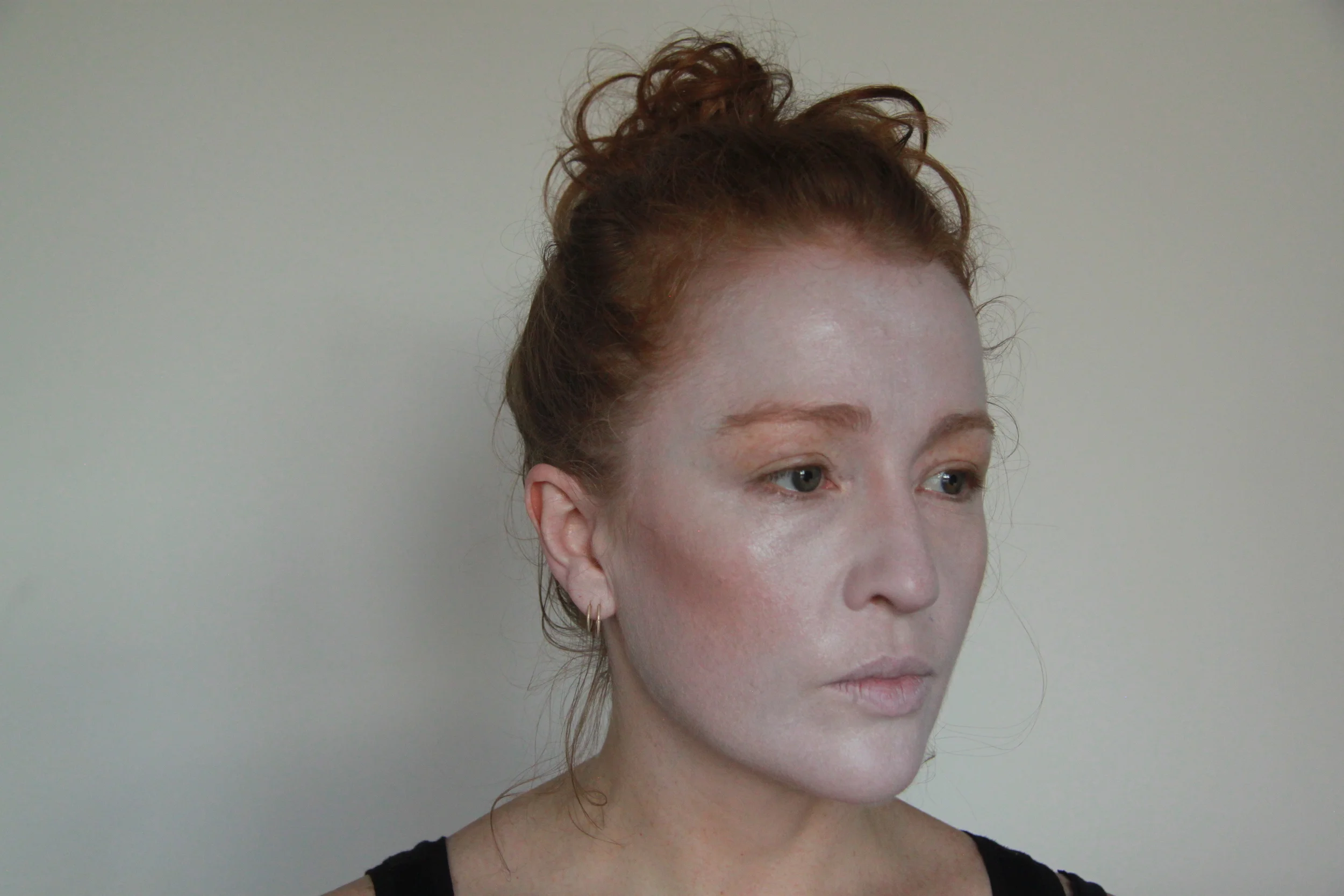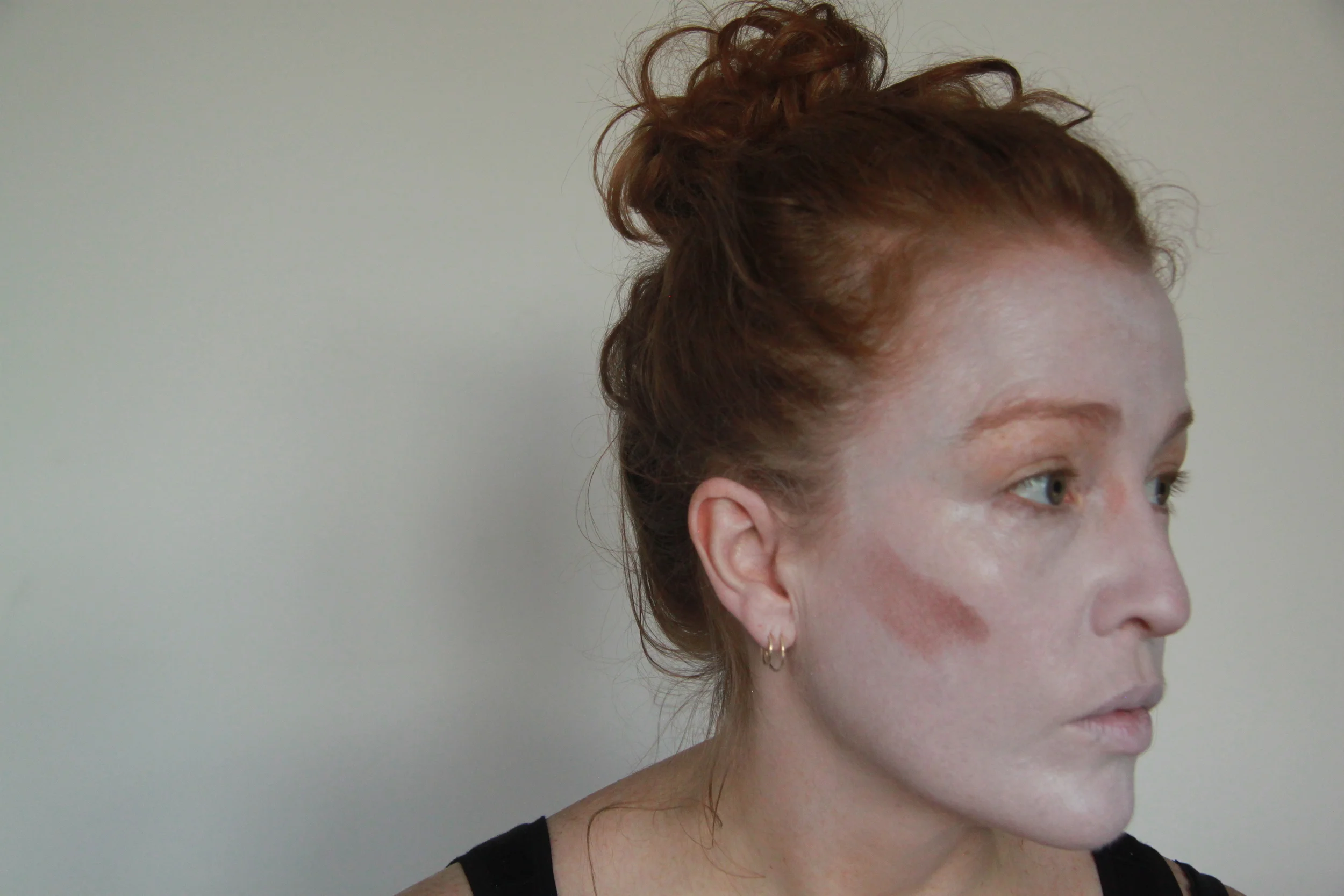 Highlight under bottom lash line with Kryolan highlight and set with Mac Mylar eye shadow. Now contour underneath the highlight with Ben Nye character shadow and set with Mac Brown Down eyeshadow.