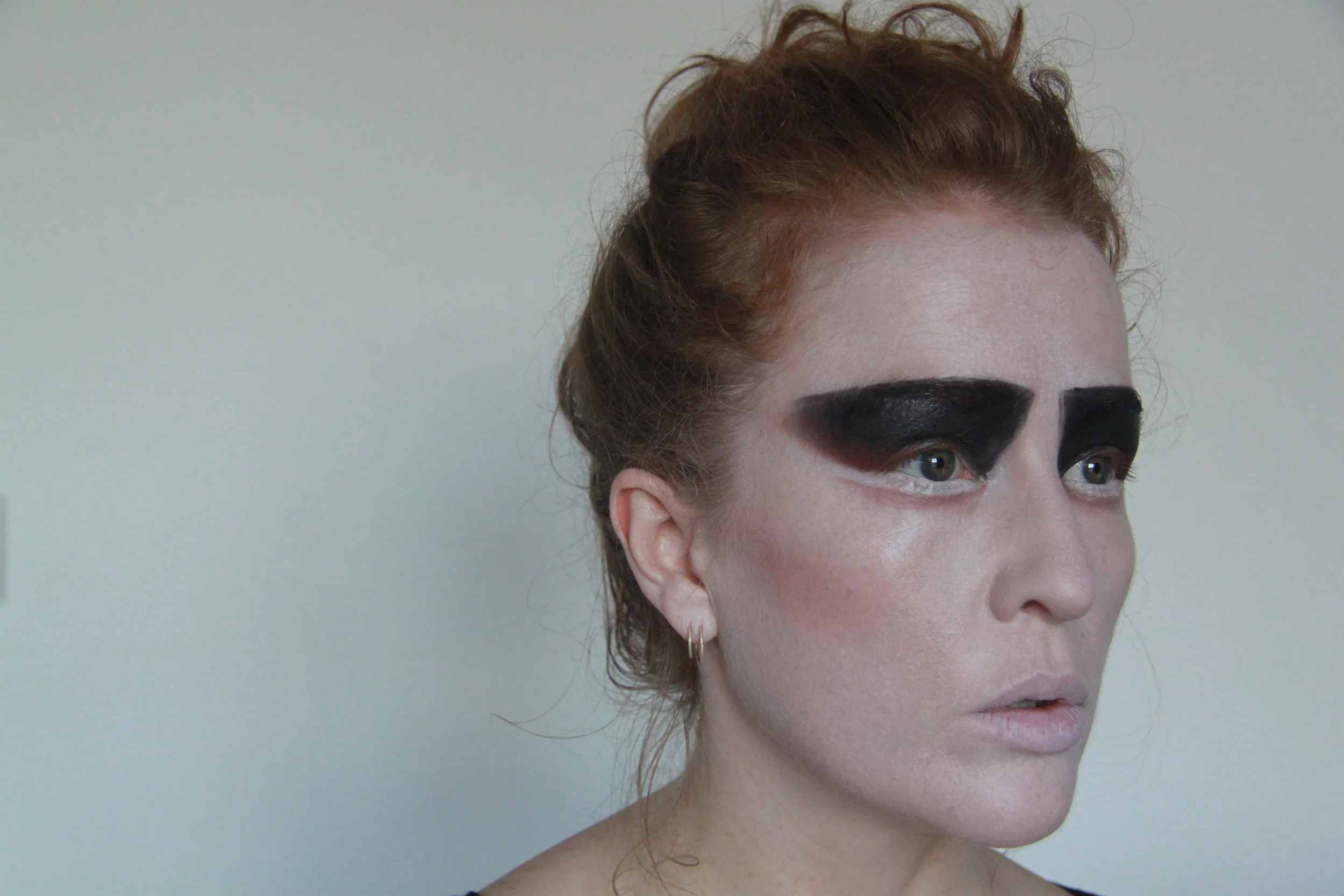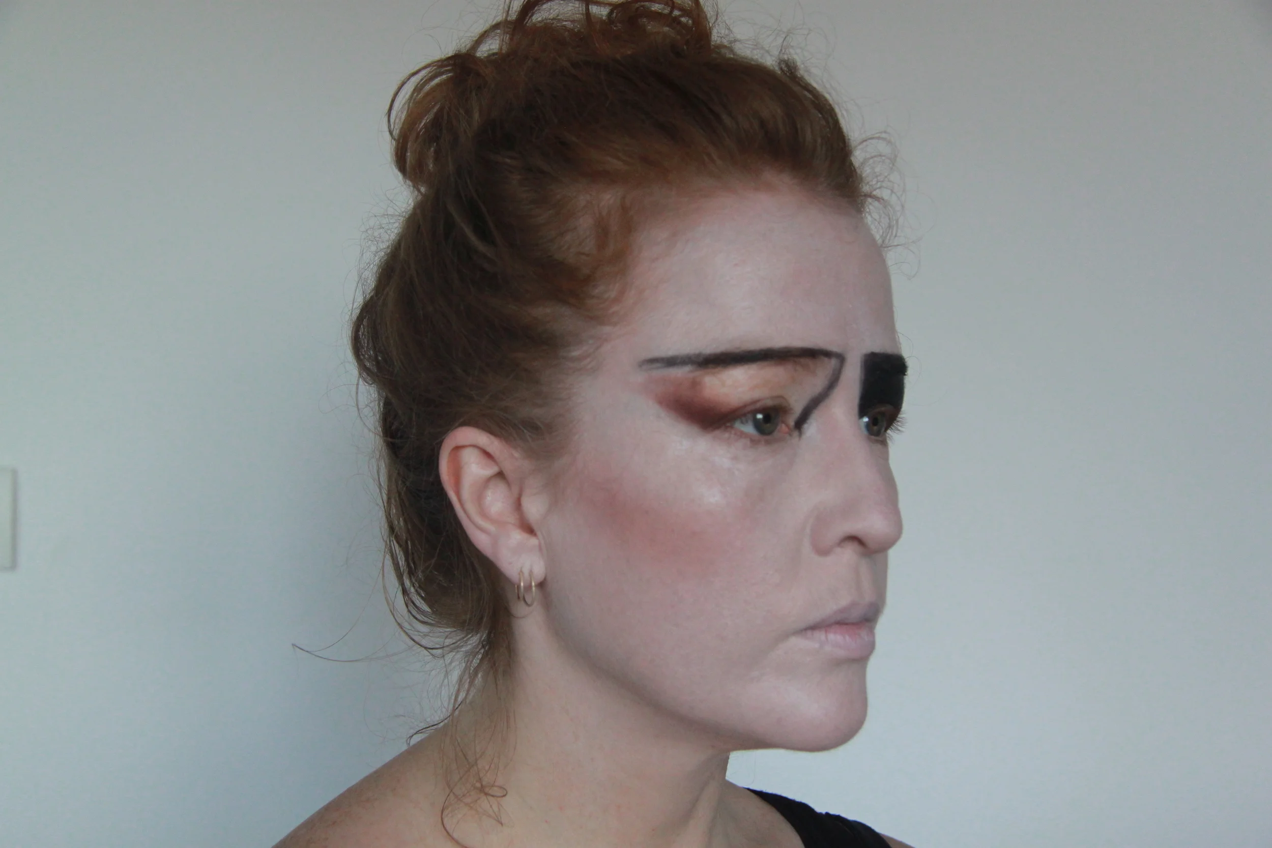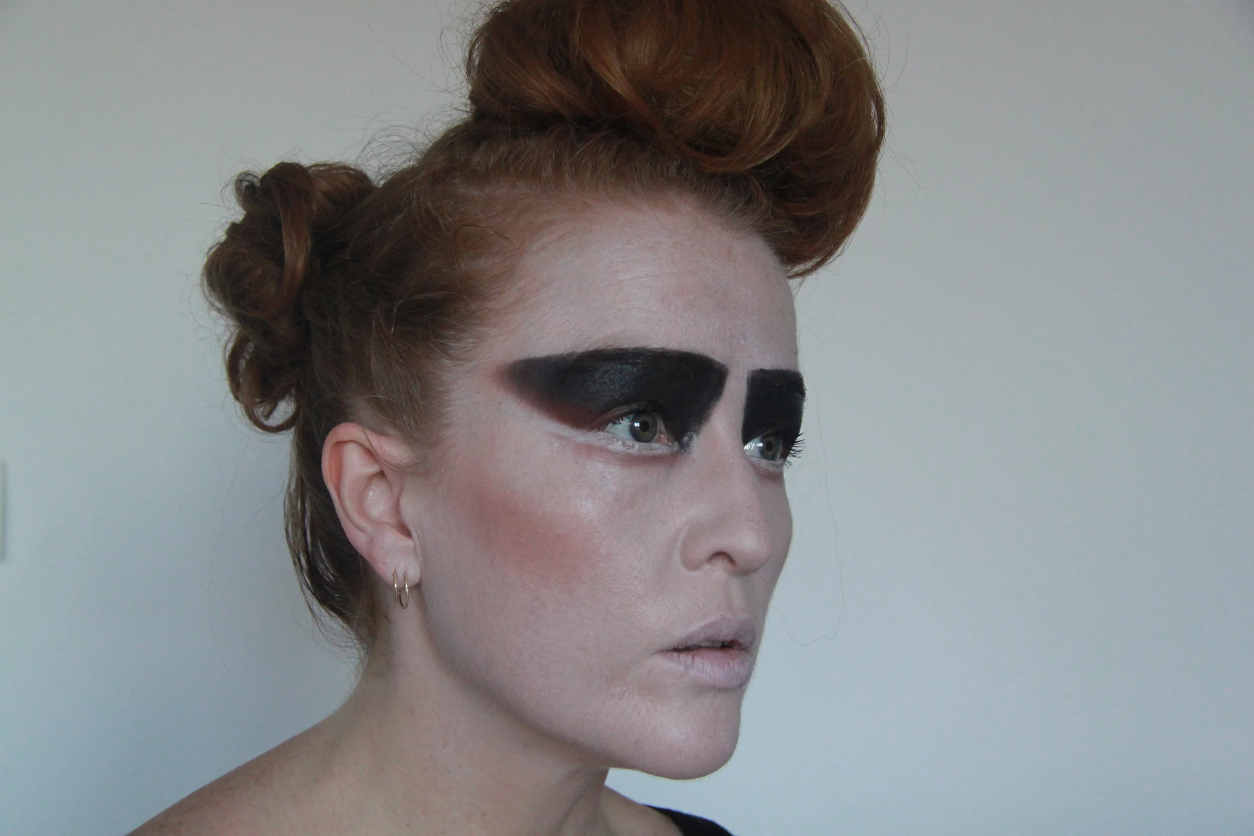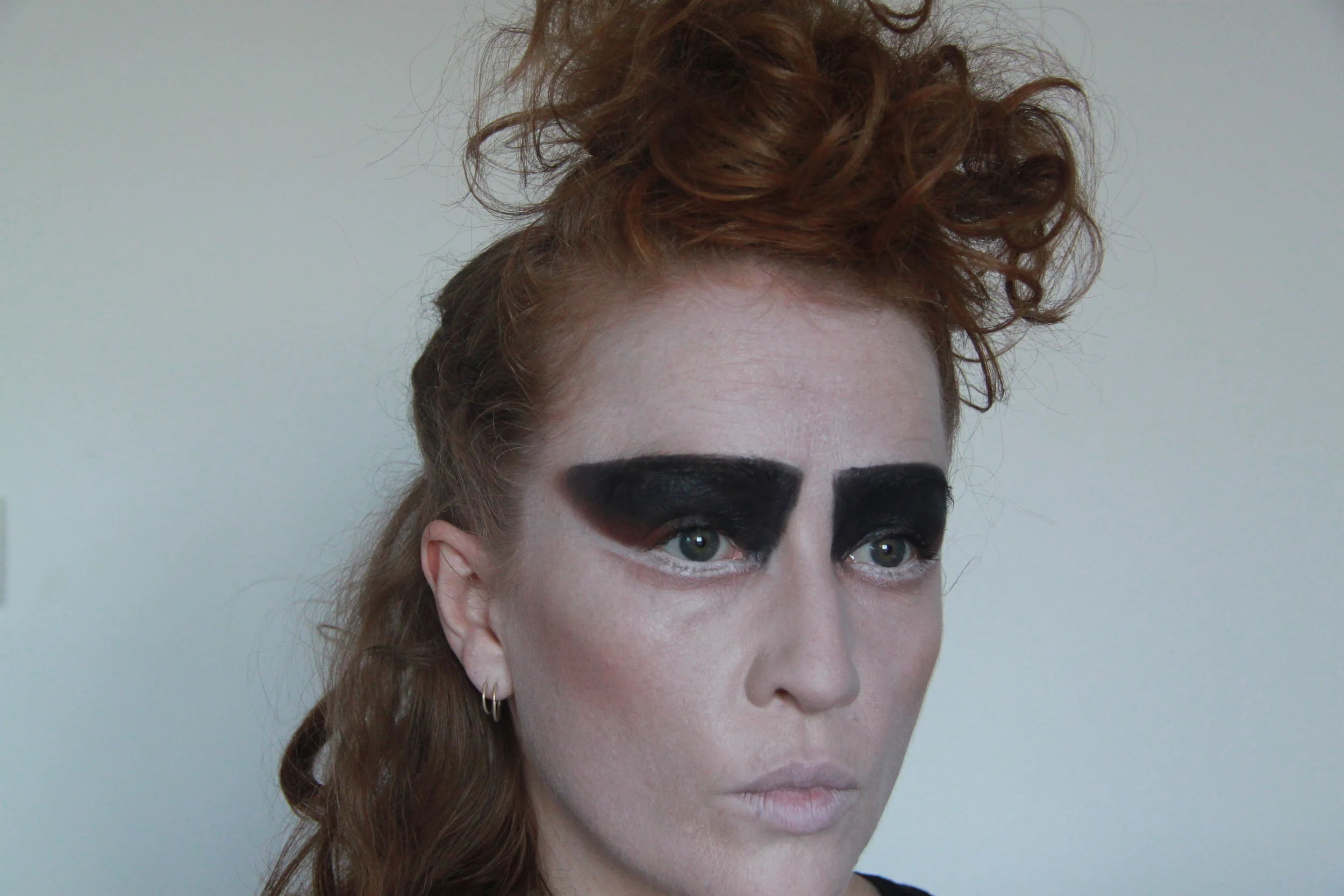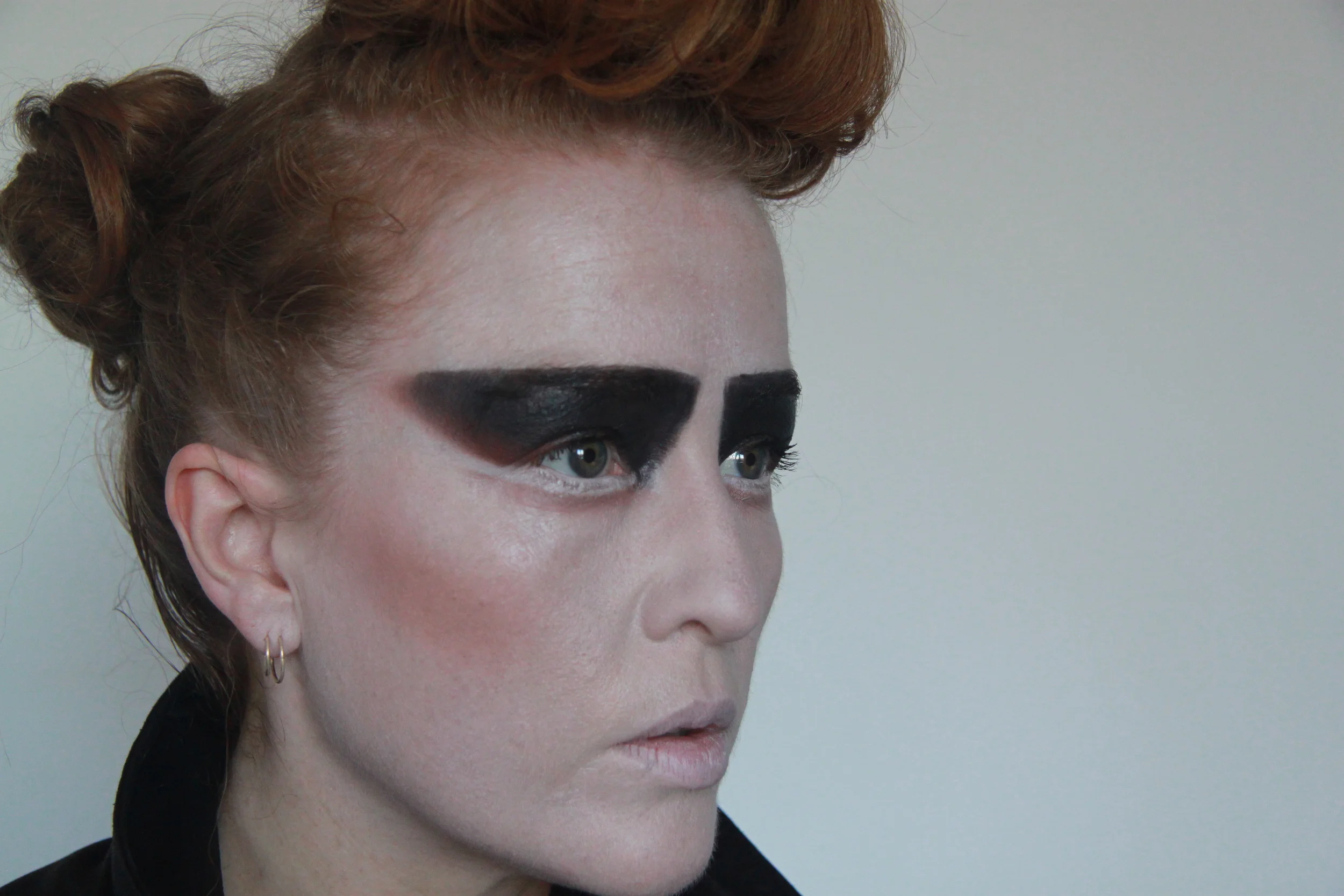 Fill inside the black lines with Ben Nye cream stick foundation in black then set with Mac eye shadow in Carbon.
