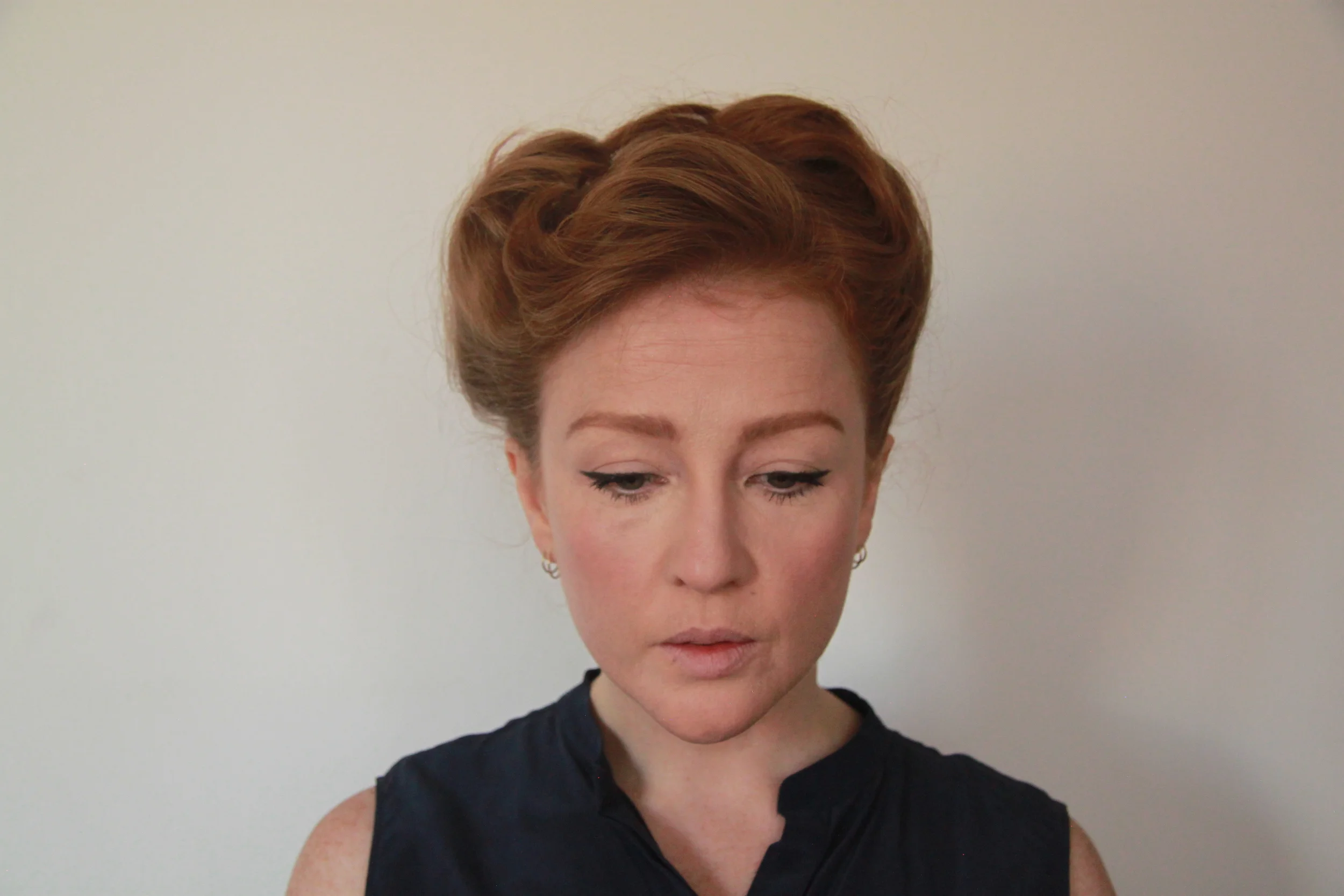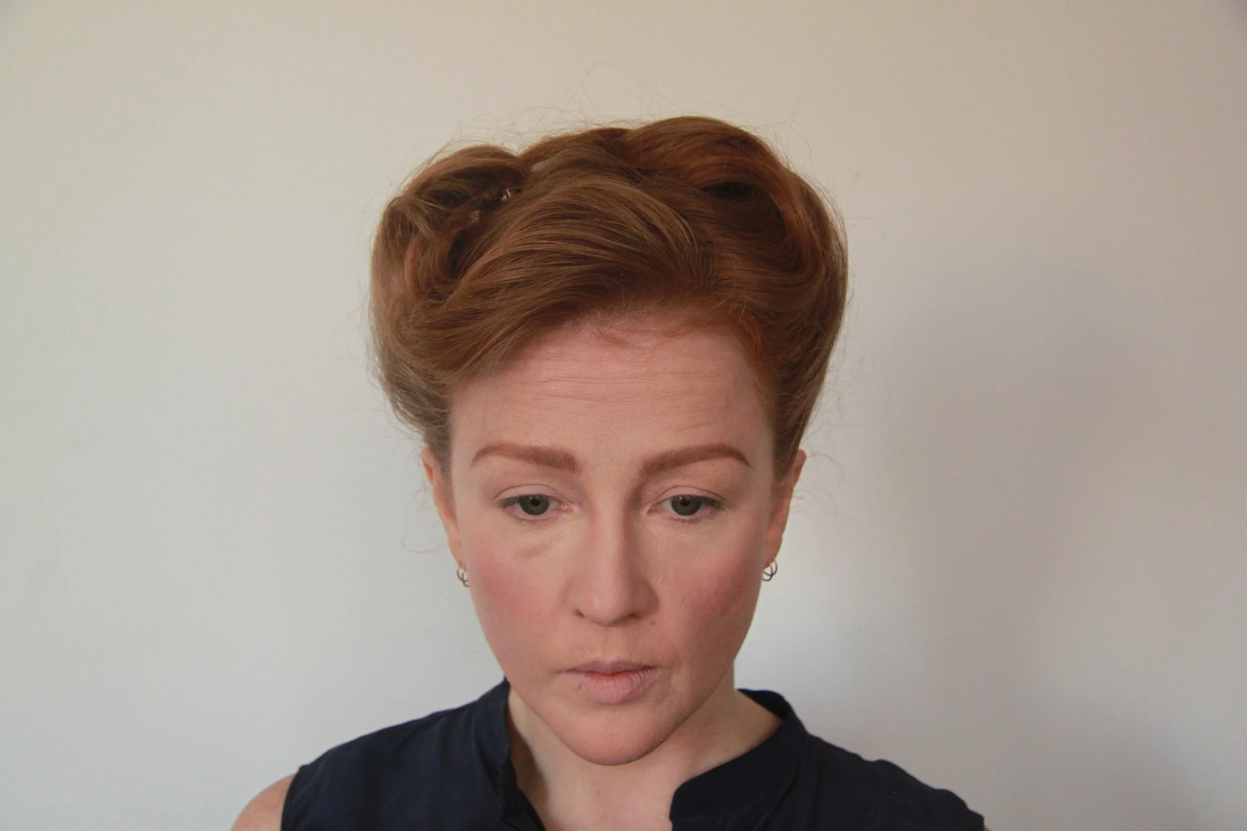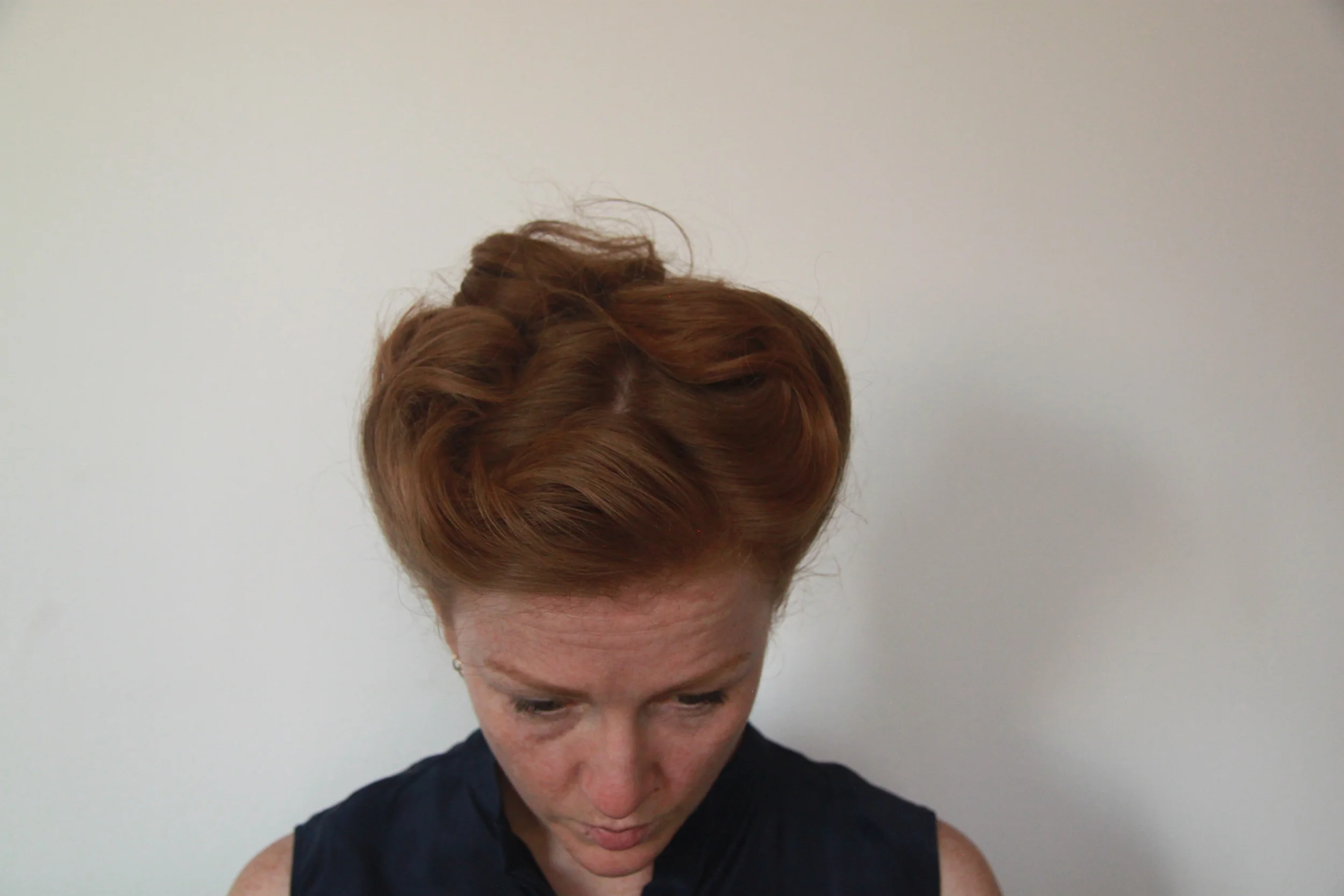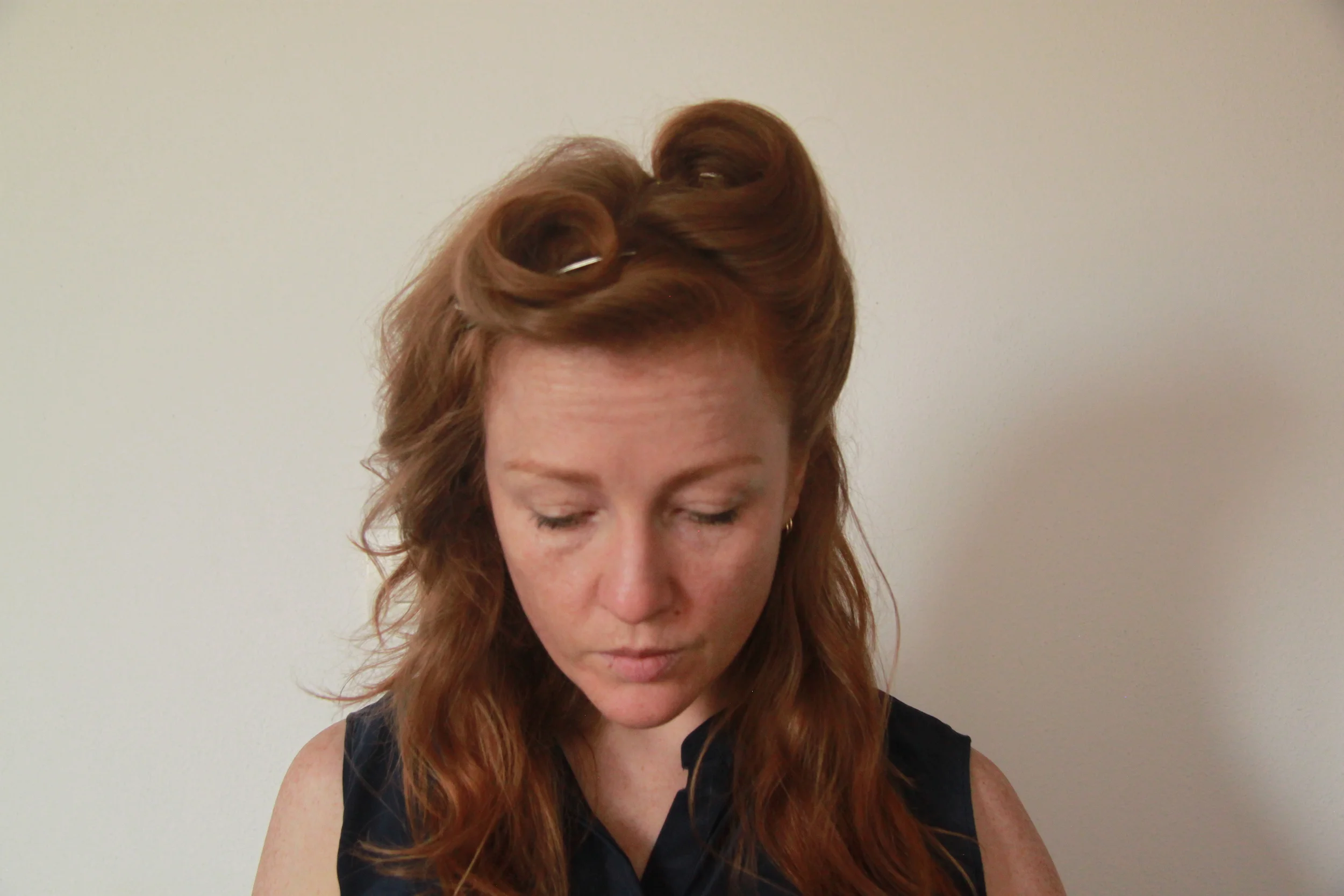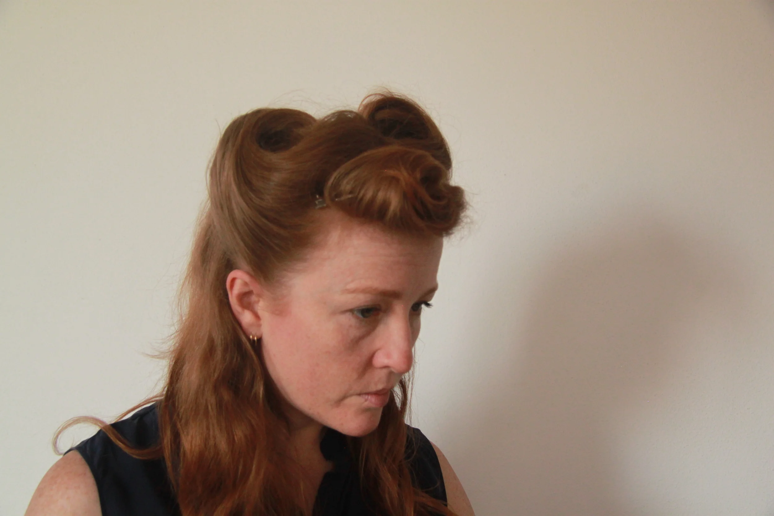 Take the first side section from just behind the ear up towards the parting, roll and secure with bobby pins.