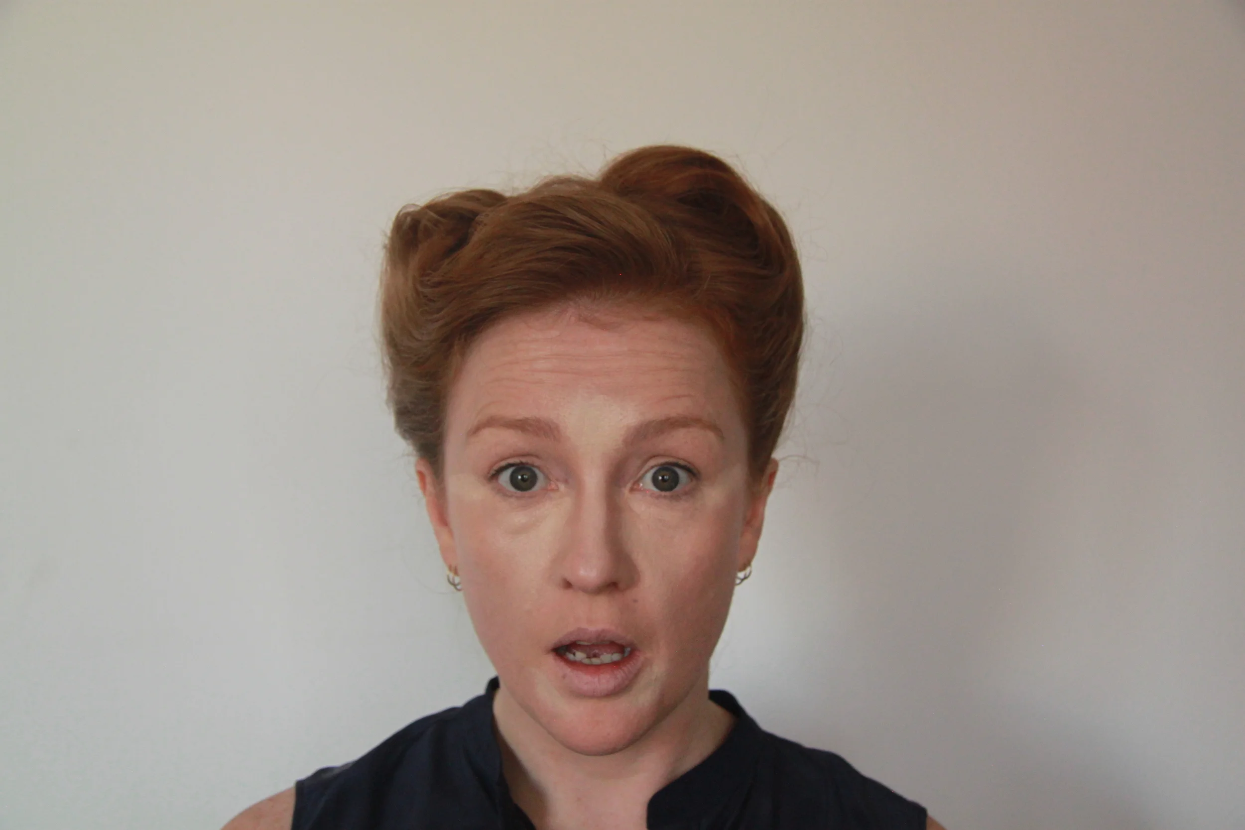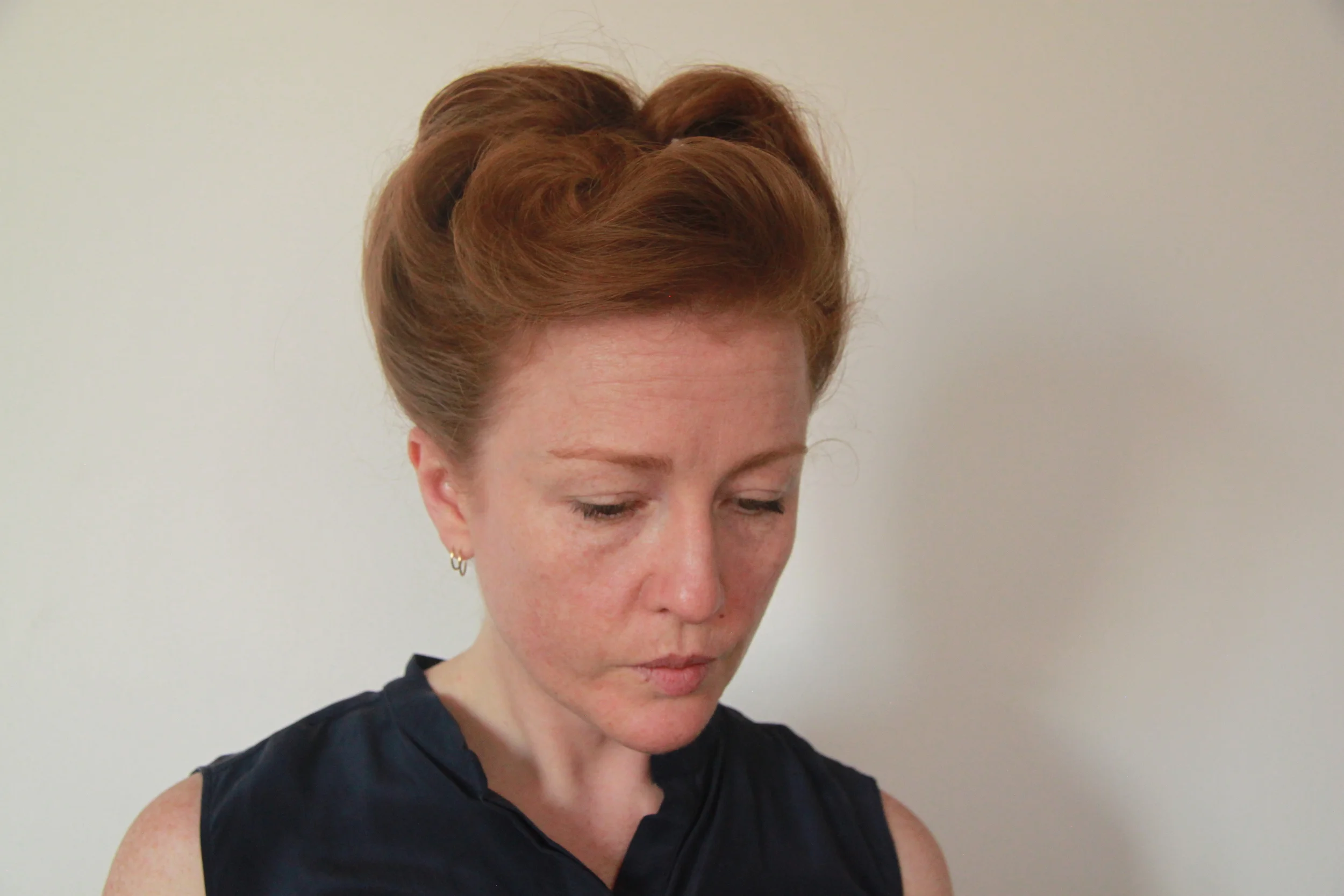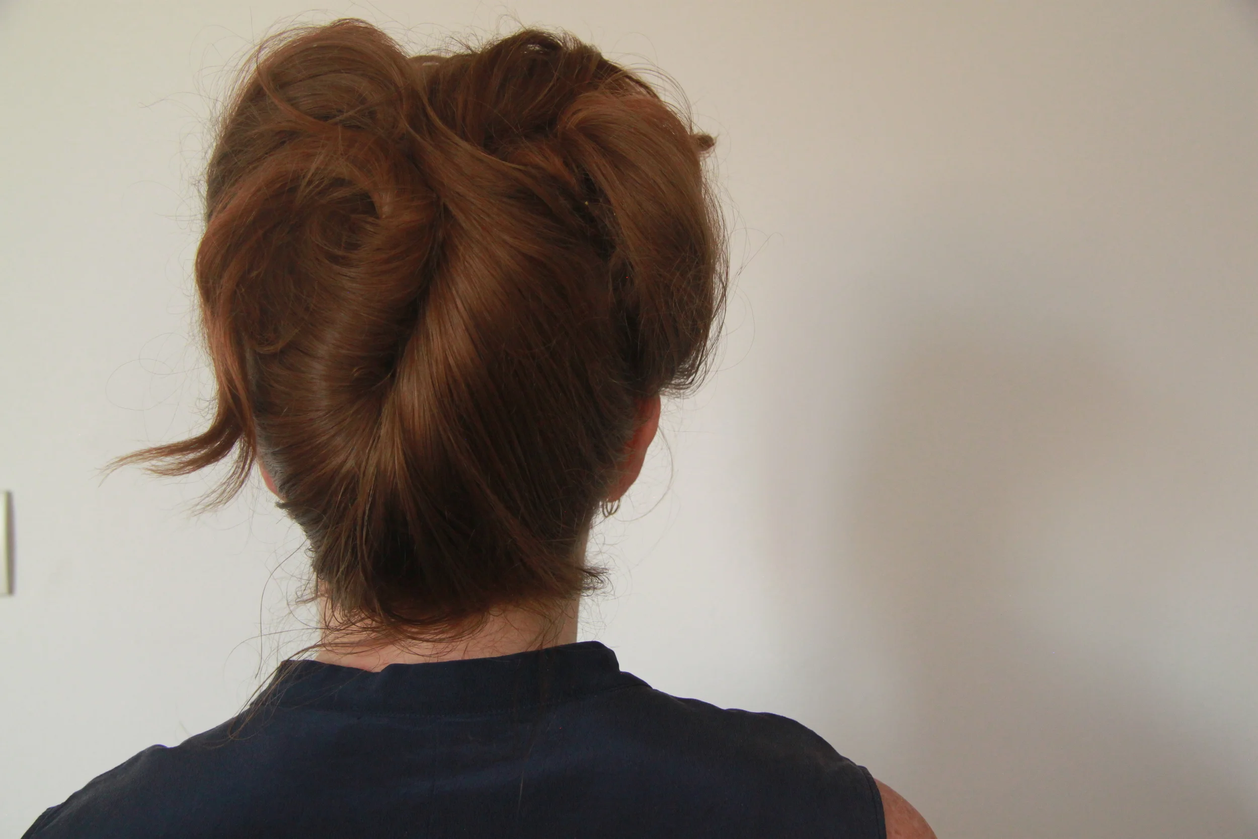 Divide the back section of hair into two sections and roll each one up, leaving the ends out, and secure with bobby pins.